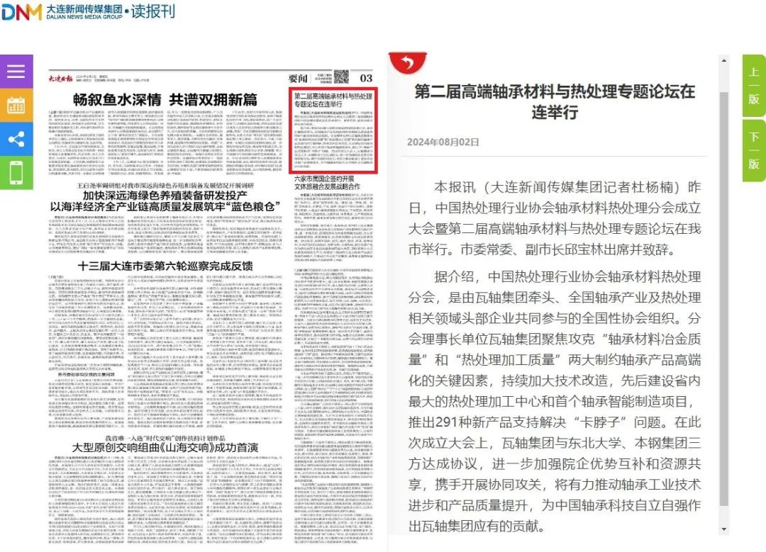 7月31日至8月2日,由中國熱處理行業協會主辦、瓦軸集團承辦的中國熱處理行業協會軸承材料熱處理分會成立大會暨第二屆高端軸承材料與熱處理專題論壇在大連香格里拉酒店舉行。會議聚焦軸承材料與熱處理技術,深入探討熱處理技術、工藝裝備、材料等方面技術進展,助力高端軸承制造,推動工業母機創新產品推廣應用,攜手共促軸承工業和裝備制造業高質量發展。來自國內外軸承材料及熱處理相關單位技術人員、行業專家近300人參加會議。
